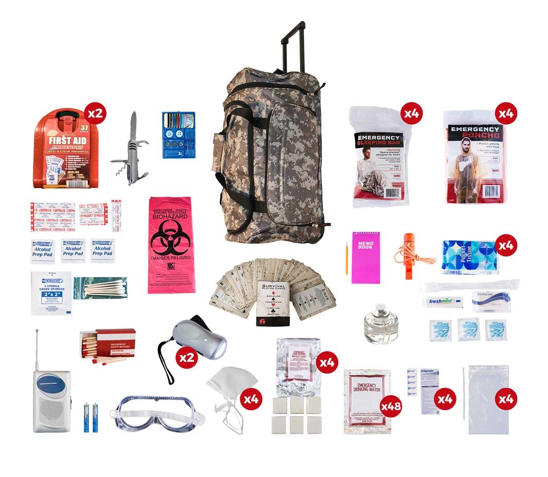 This kit was designed using advice from experts in the field of emergency preparedness. It follows guidelines offered by government agencies and nonprofit preparedness organizations. This 4-person deluxe kit has a retail value of $180.