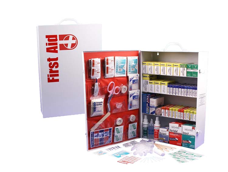 This 4-Shelf First Aid Cabinet was designed by leaders in the emergency preparedness industry. This kit contains 1321 pieces that are packaged neatly into a white steel case that can be mounted on a wall for easy access.