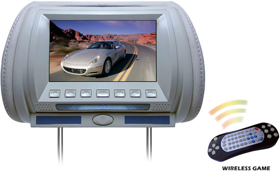 Adjustable Hideaway Headrest 7” TFT Video Monitor w/Built-In DVD/USB/SD Player & Wireless IR/FM Transmitter/ Built-in 32 Video Game System (GREY COLOR) (RBPL70HDG)