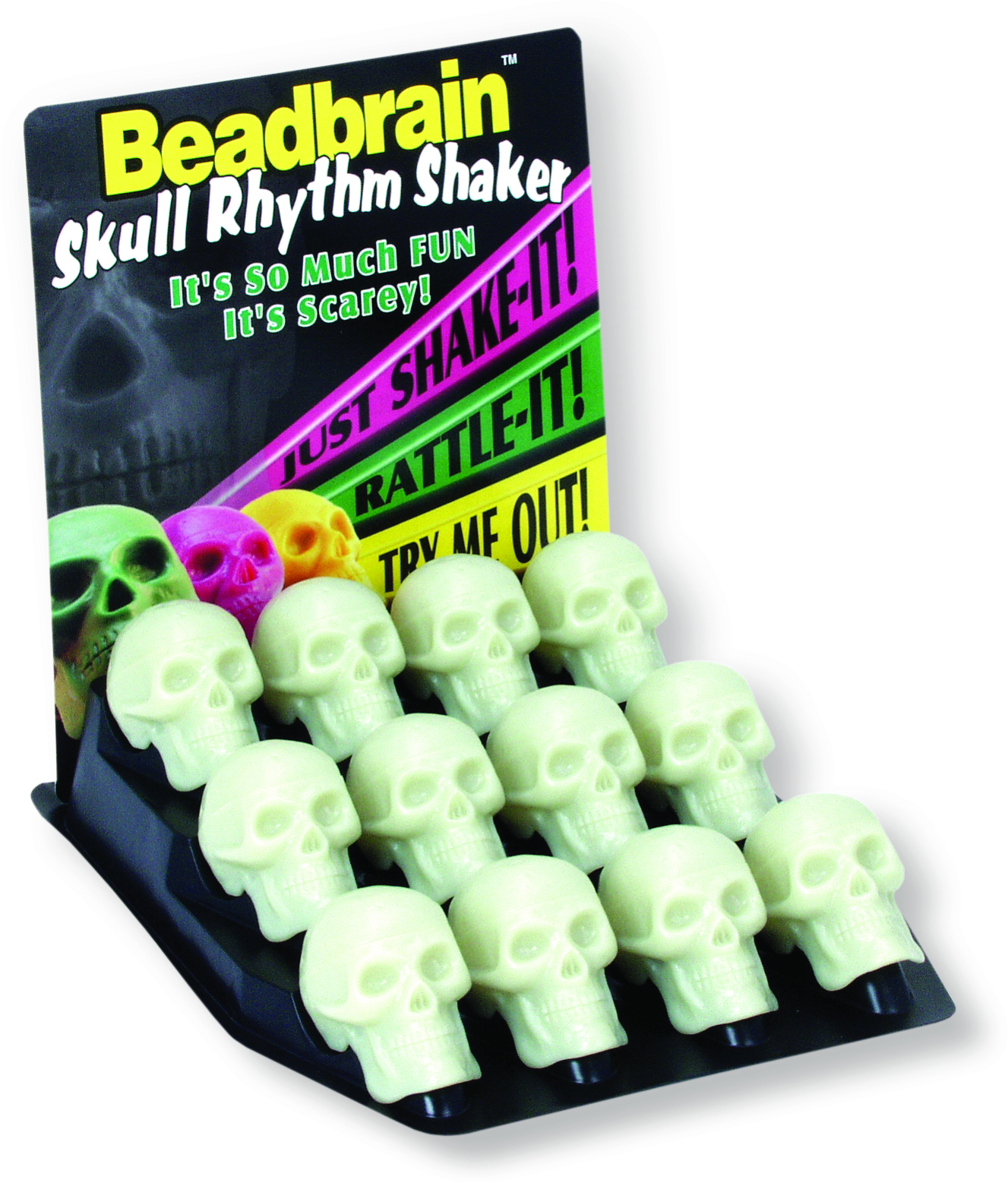 Beadbrainâ„¢ skull shaker glow in-the dark display.
